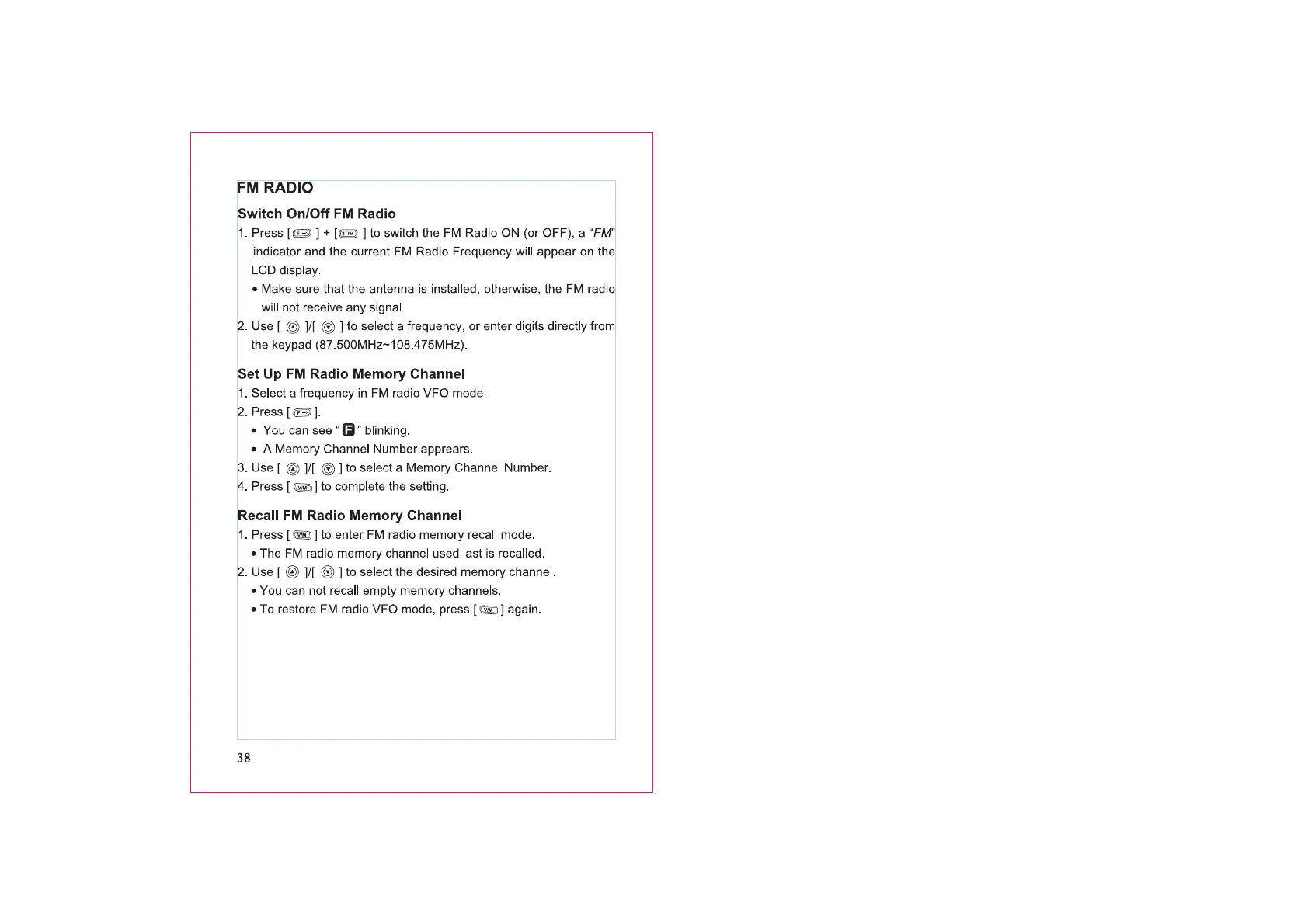 Weierwei VEV-V8 - FM Radio; Switch On;Off FM Radio; Set up FM Radio Memory Channel; Recall FM Radio Memory Channel