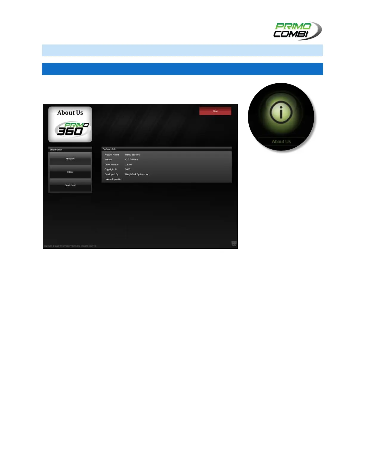 The About Us screen displays information about the operating system, contact