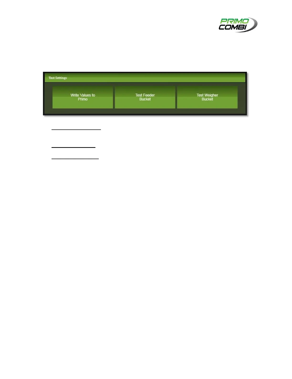 Test Feeder Bucket – This will activate the Feeder Bucket.