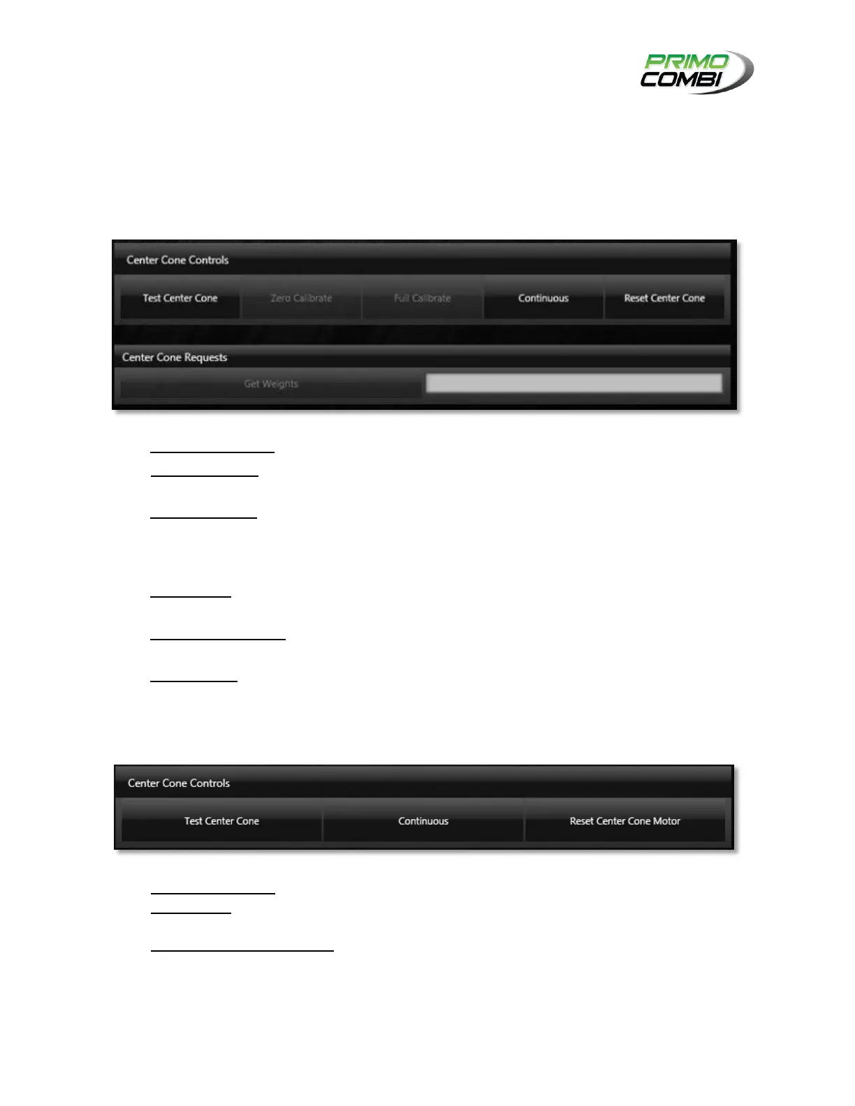 TEST CENTER CONE – Pressing this button will activate the center cone motor.
