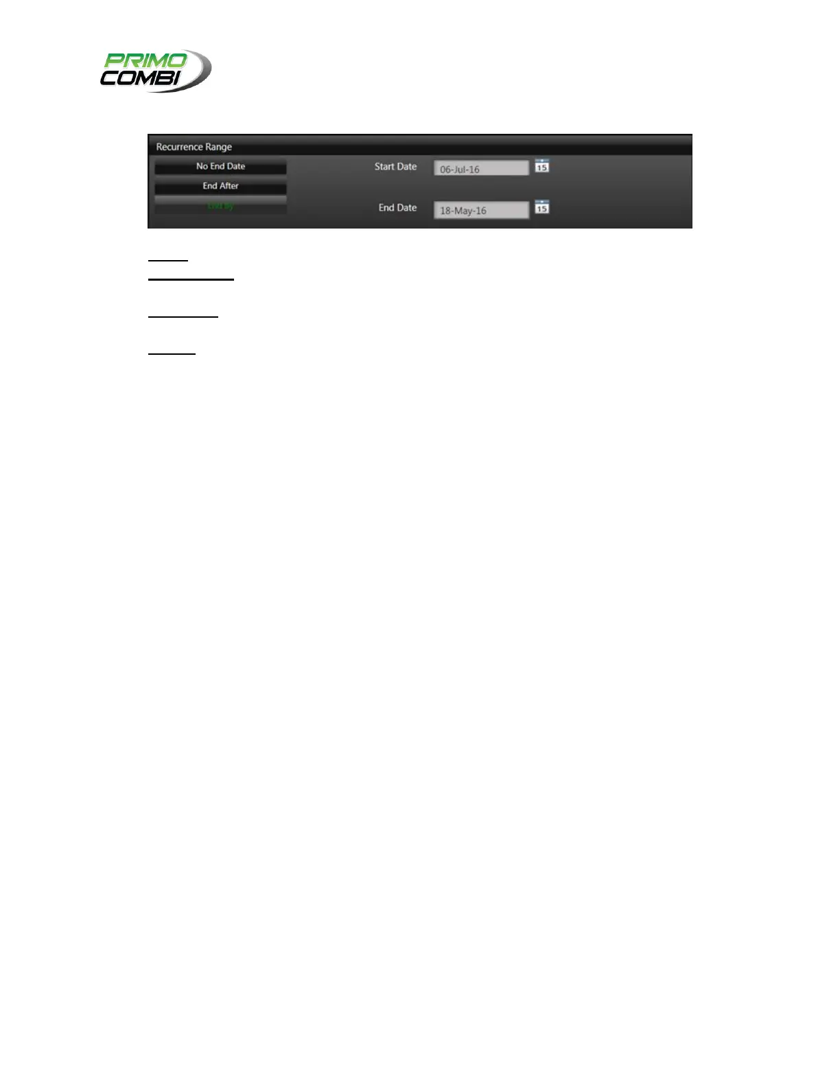 NO END DATE – Specifies that the schedule is to occur indefinitely until the operator specifies that