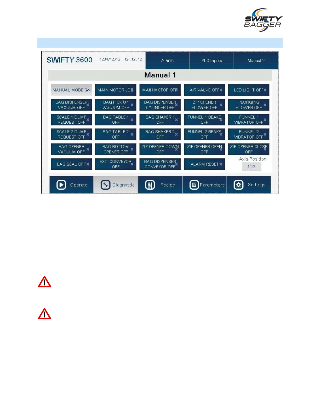 machine, displaying “Manual Mode ON” when in manual mode. The other buttons in the manual 1
