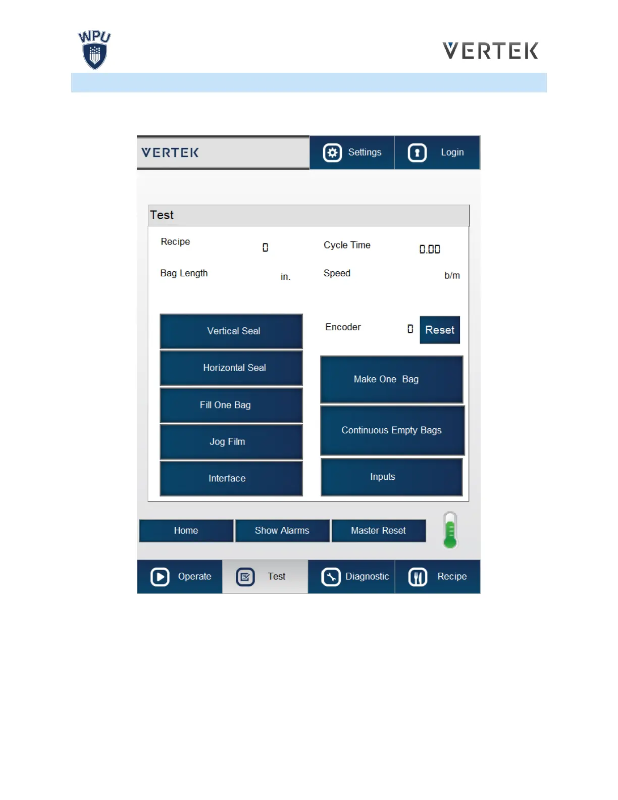 The Test screen allows the operator to run the bagger in a semi-automatic mode. In this mode, the