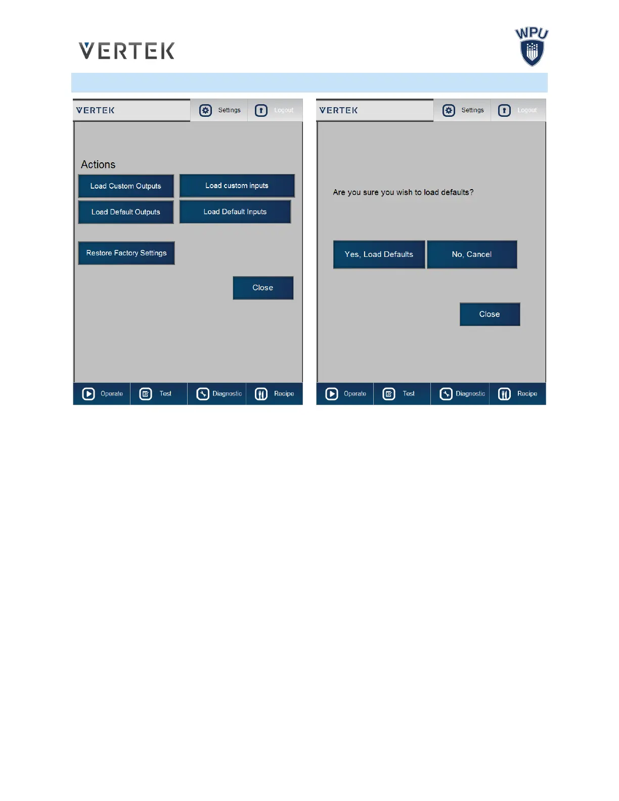 Action Screen is used to load custom settings and to confirm the operator’s choice to revert to default