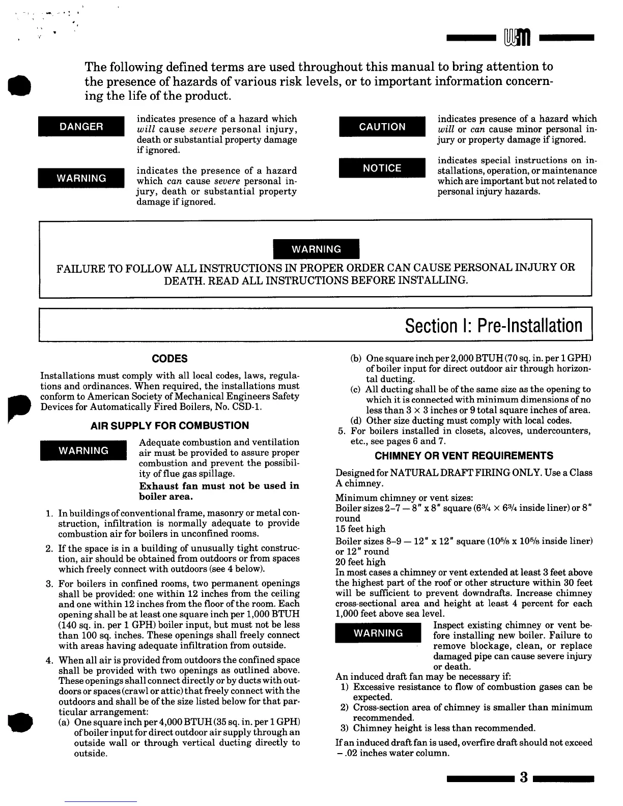 Weil-McLain 68 - Section I: Pre-Installation; AIR SUPPLY FOR COMBUSTION; CHIMNEY OR VENT REQUIREMENTS