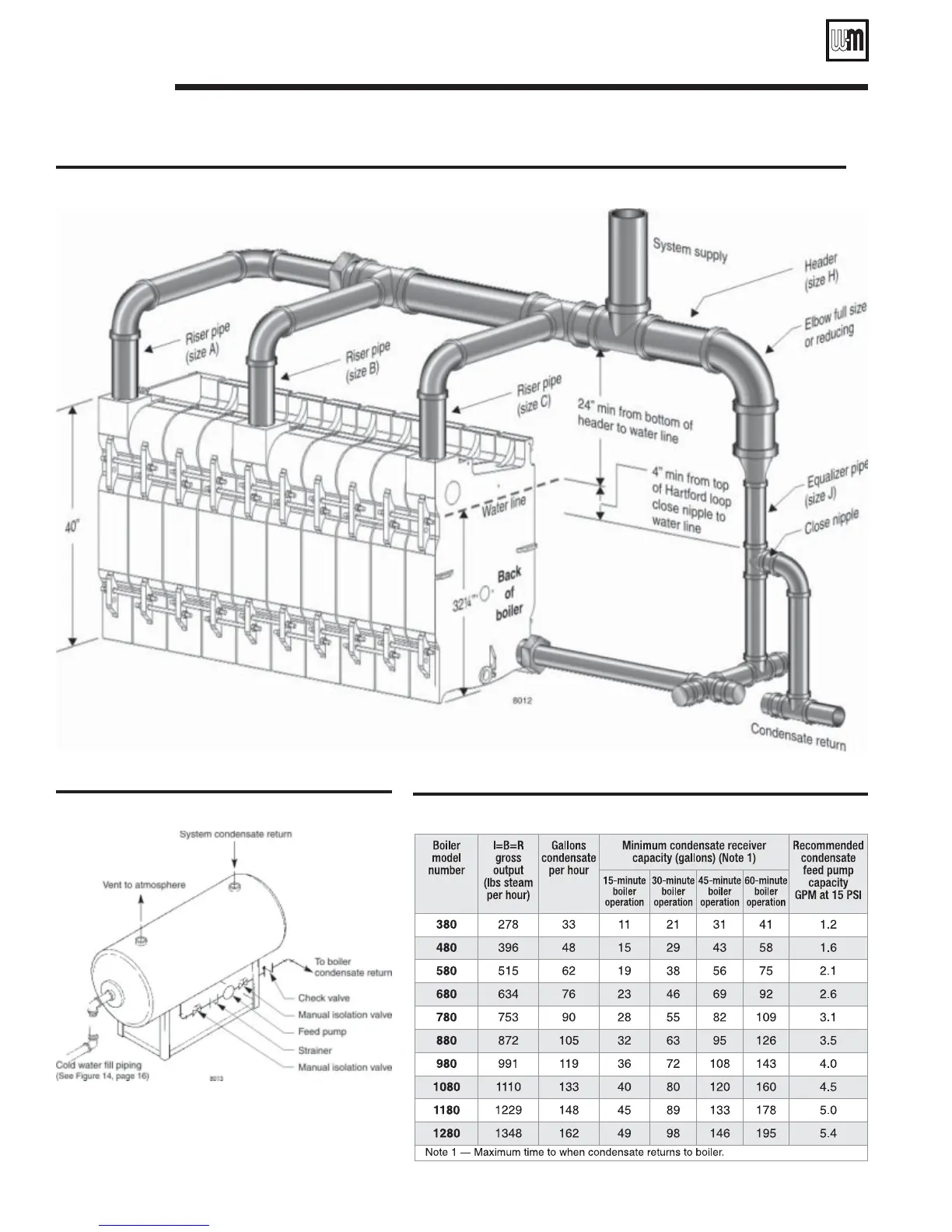 Figure 17 Model 1080 through 1280 steam boiler piping — NOTE minimum 24 inches between boiler water line and
