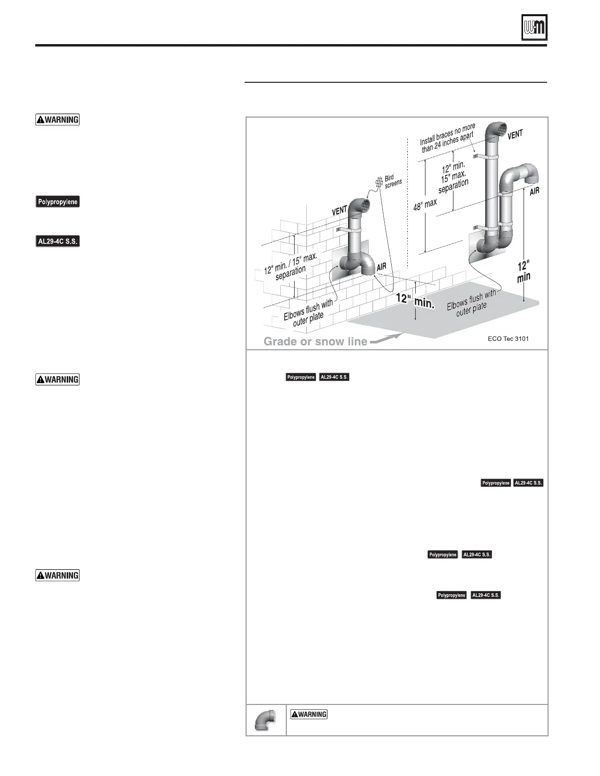 — DO NOT use short radius elbows for vent or air piping. Boiler