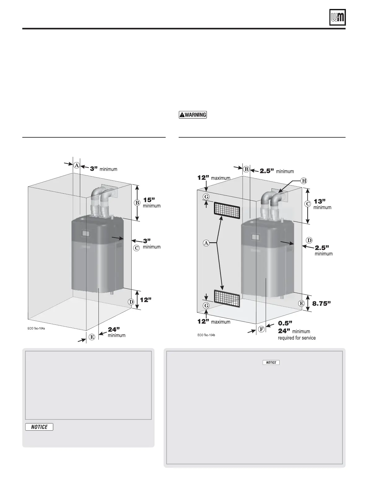 above floor for garage installations) for wall hung installation, 0 inches minimum for