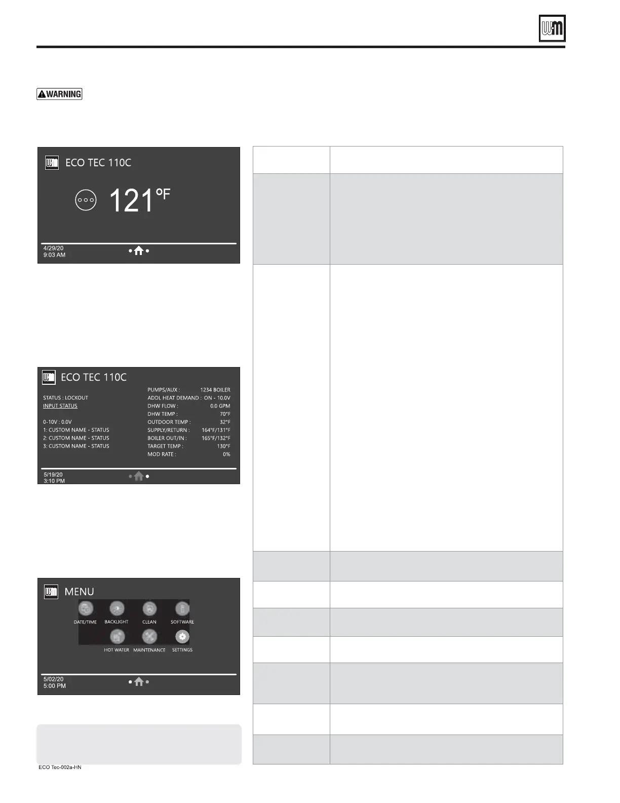 Weil-McLain EcoTec 80 - HOMEOWNER NAVIGATION Menus