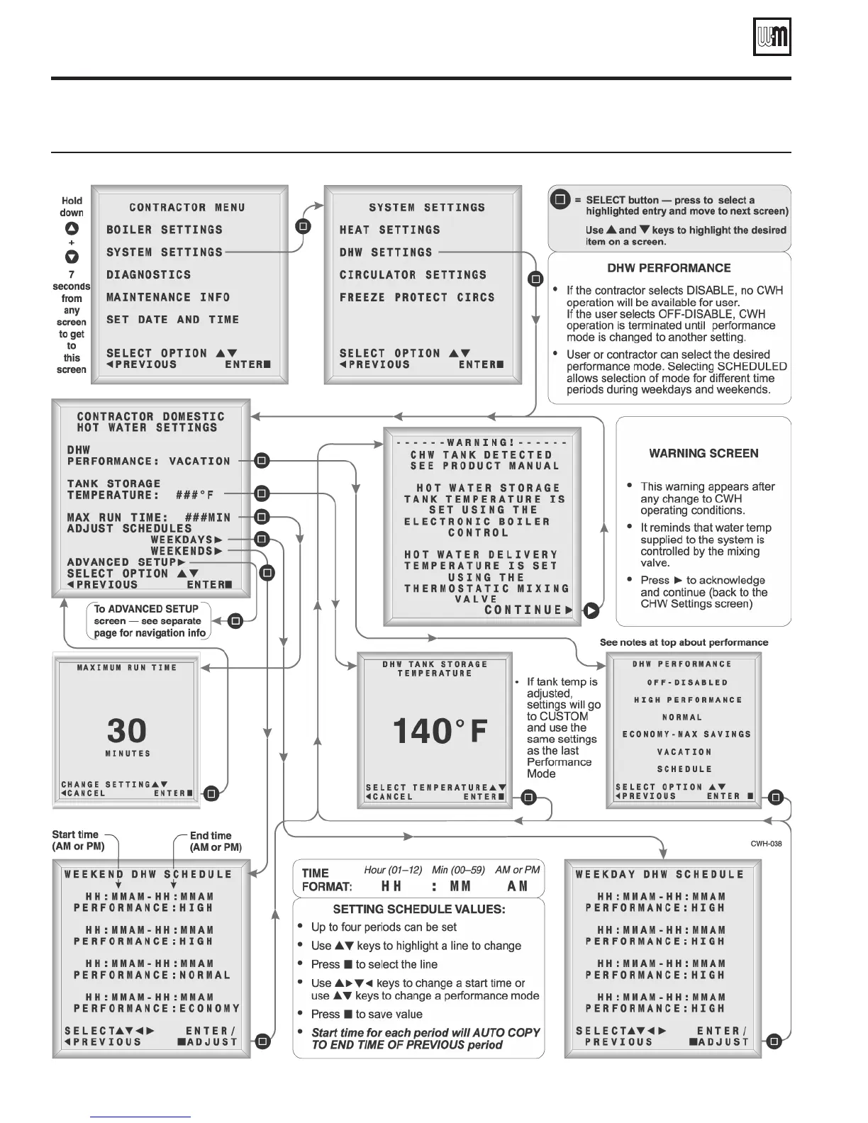 Figure 20 Contractor DHW SETTINGS menus (see Figure 21, page 27 for setting values and descriptions)