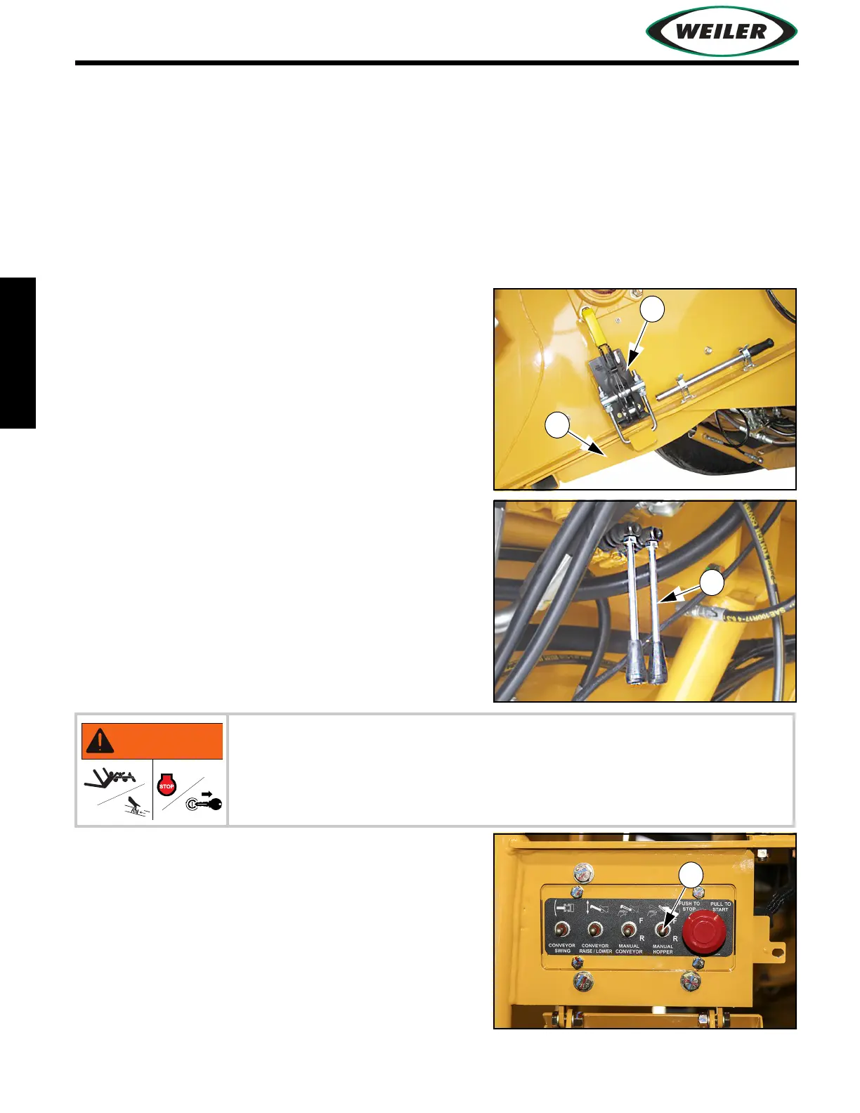 Turn engine off before manually removing material from stalled elevator.