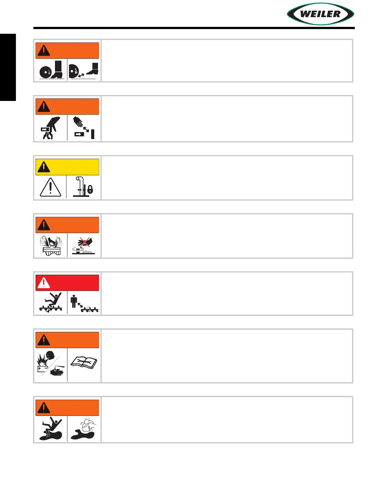 Entanglement in rotating augers can crush or cut off hands and feet.