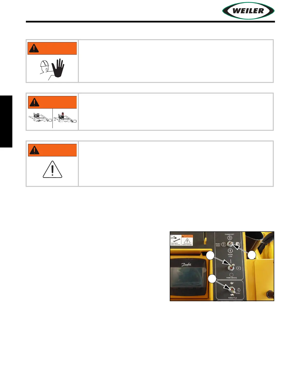 starting engine or moving machine. Ensure area is free of personnel. Keep