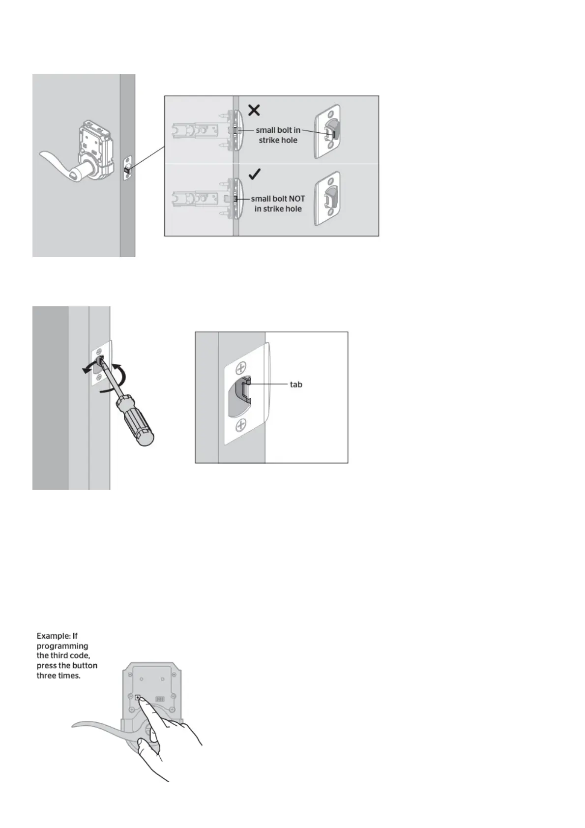 The small bolt of the latch should not enter the strike hole. If it enters the strike hole, reposition strike.