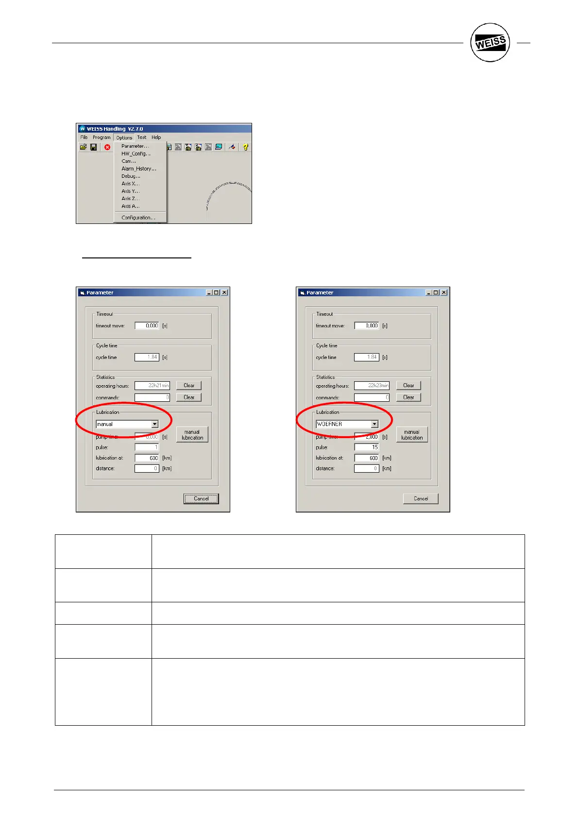 Lubrication: - When selecting "manual“ for Lubrication, parameters can only be read. When the