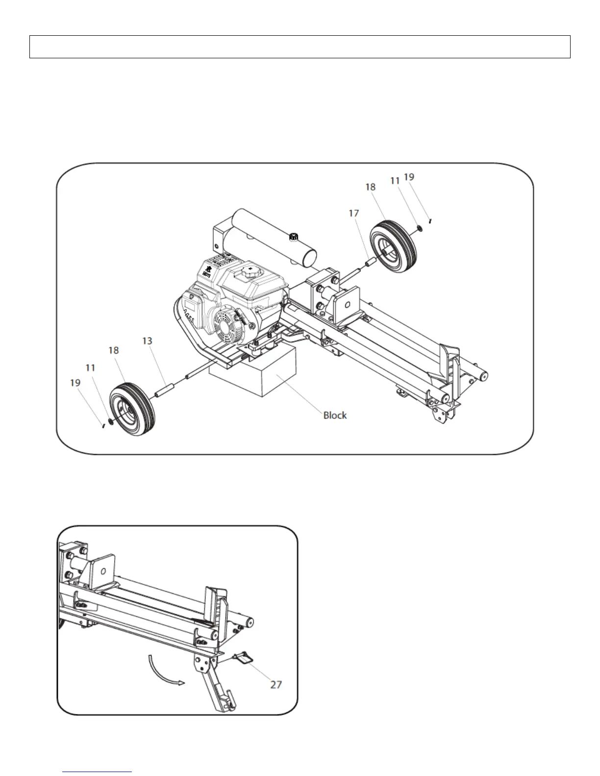 1. Rotate the front support leg up and secure with front leg pin set (#27).