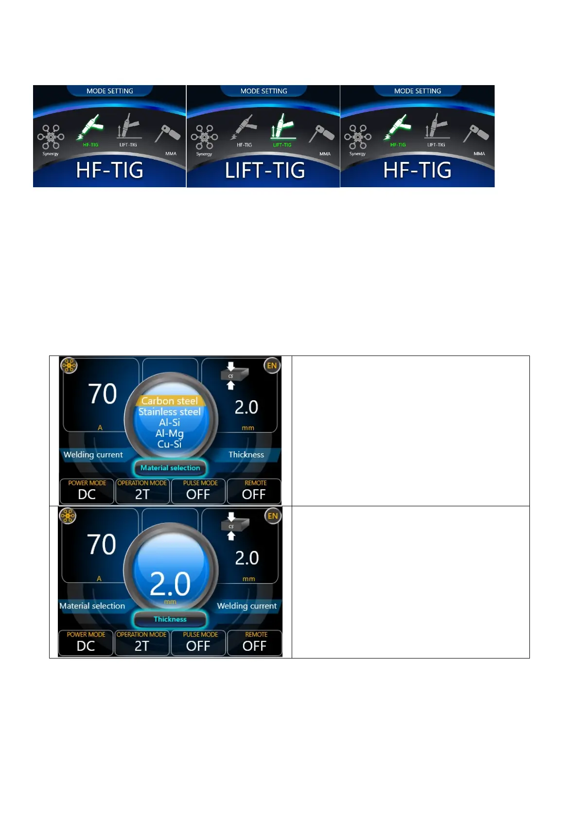 W trybie Auto możliwy jest wybór materiału oraz jego grubości, następnie możliwe jest rozpoczęcie spawania,