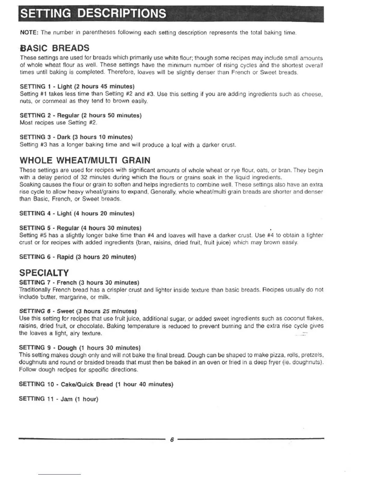 Welbilt ABM2900 - Setting Descriptions; Basic Breads; Whole Wheat;Multi Grain; Specialty