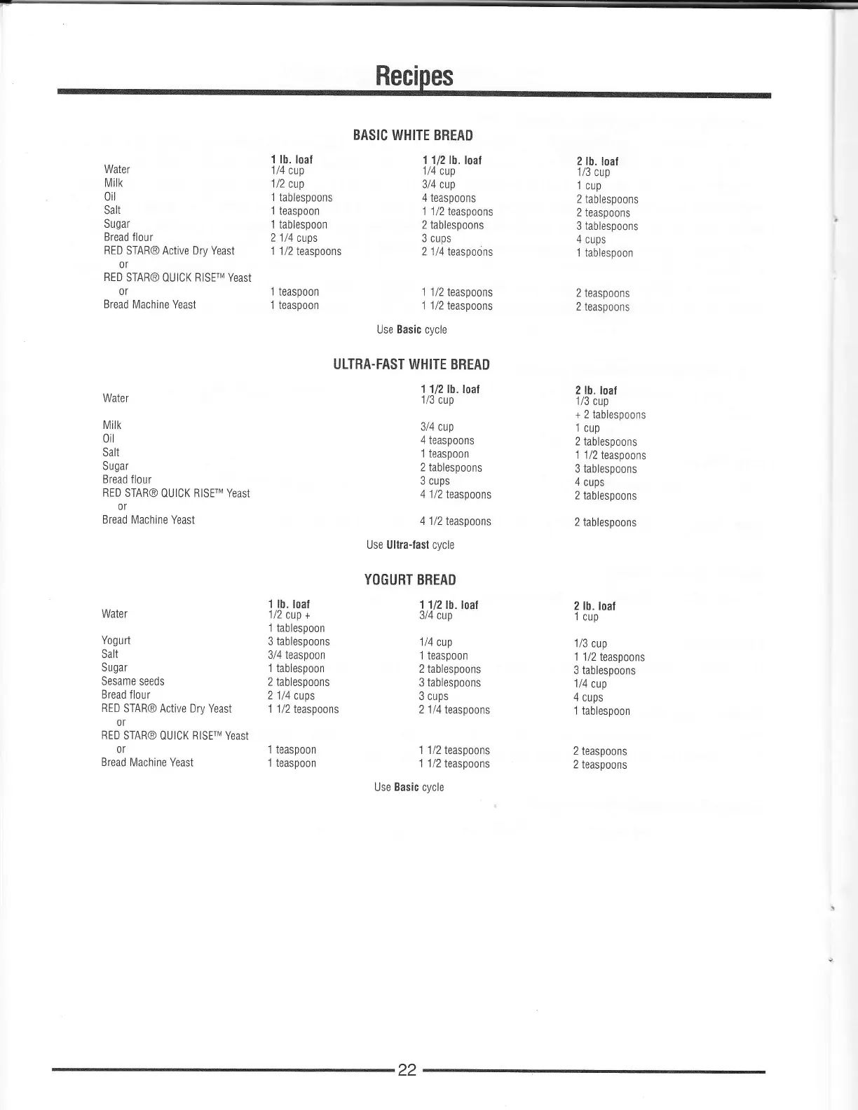 Welbilt ABM2H52 - Recipes; Basic & White Bread Recipes