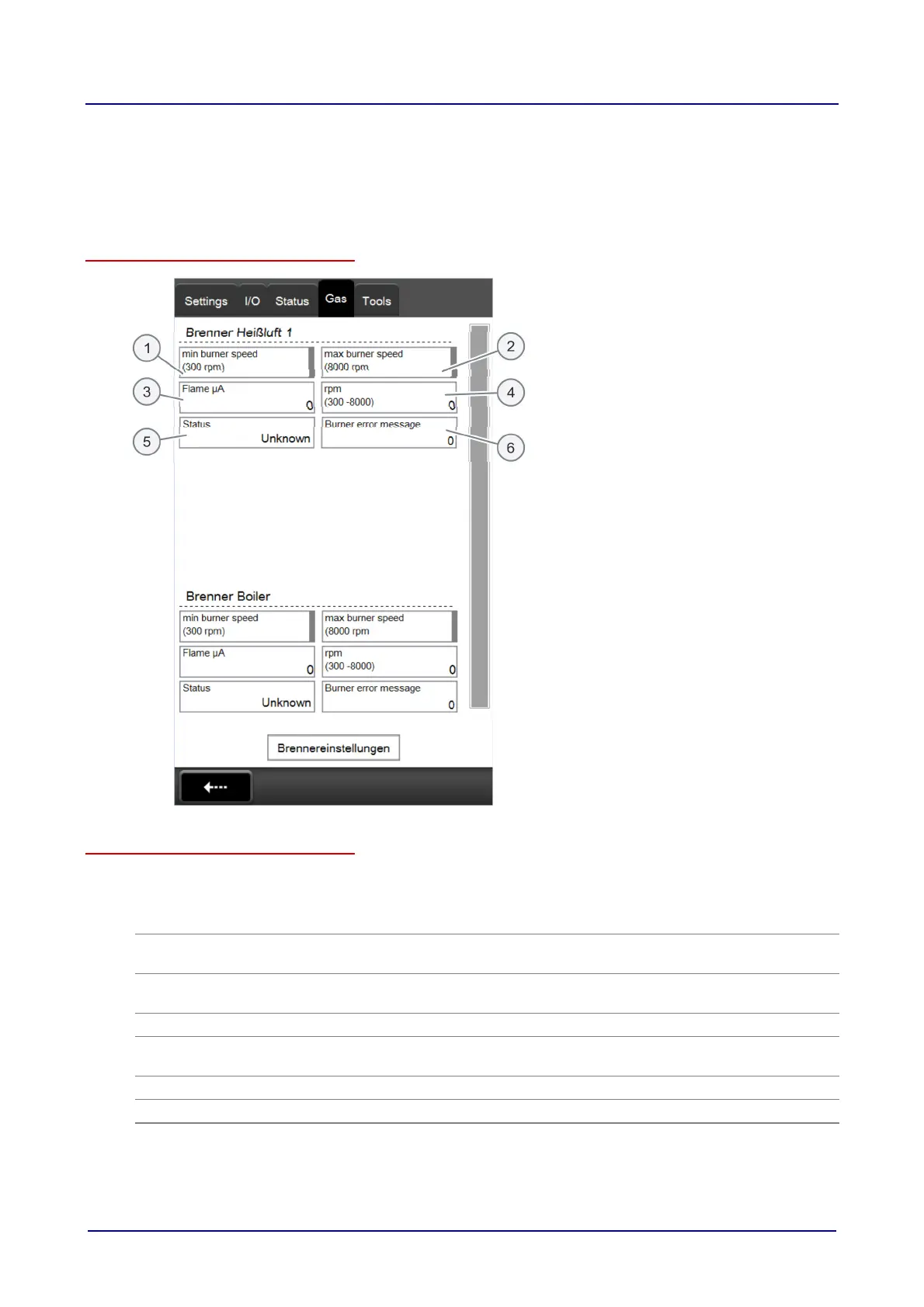 The 'Gas' tab provides a facility for diagnostic testing and burner adjustment in gas appliances.