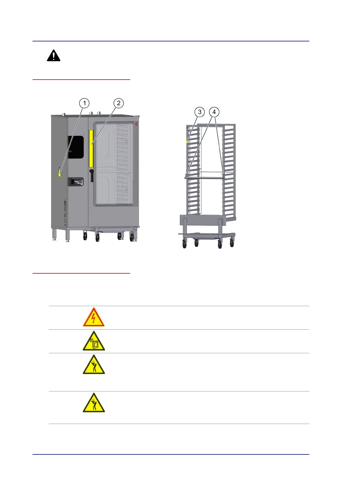The following warning signs must be attached to the combi oven and accessories in the area indicated so as to be easily
