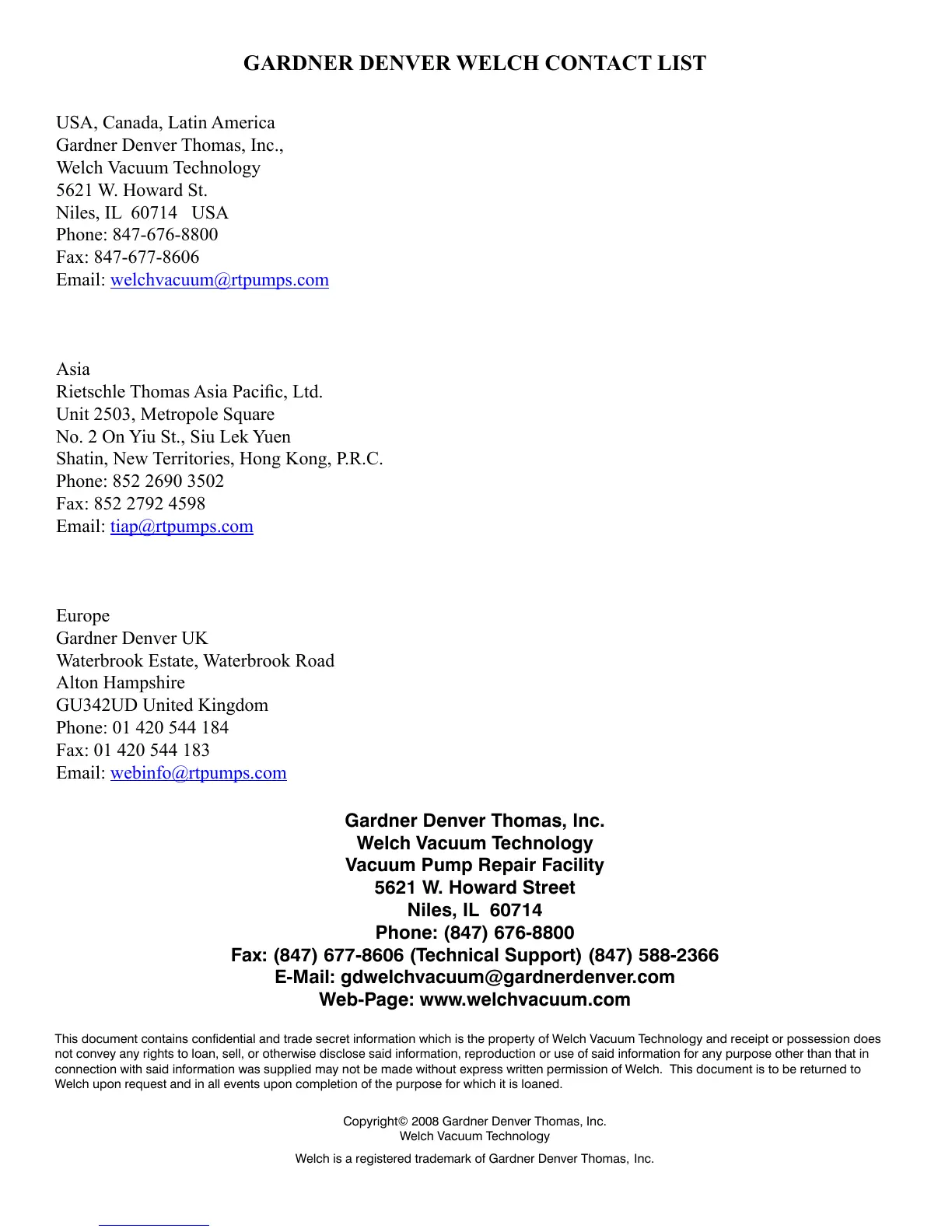 This document contains confidential and trade secret information which is the property of Welch Vacuum Technology and receipt or possession does