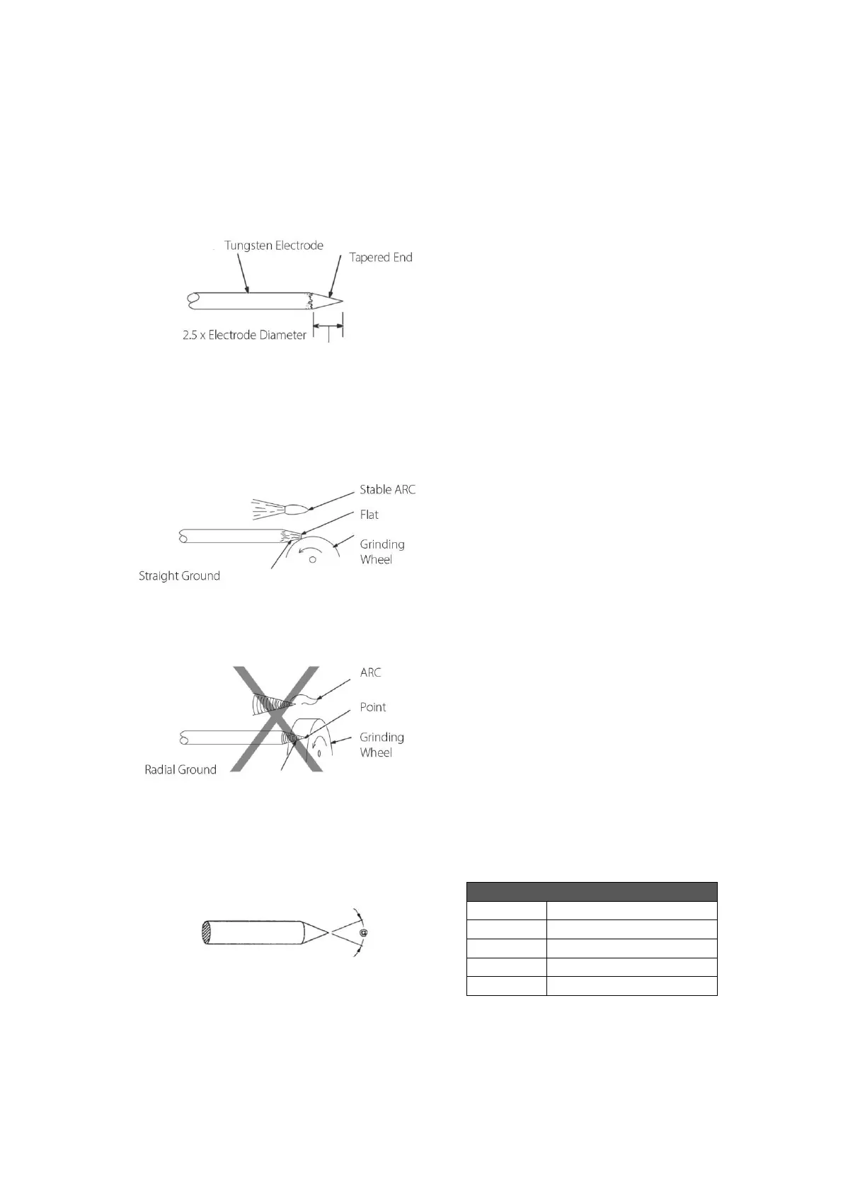 Grind end of tungsten on fine grit, hard abrasive wheel before welding. Do not use wheel for other jobs