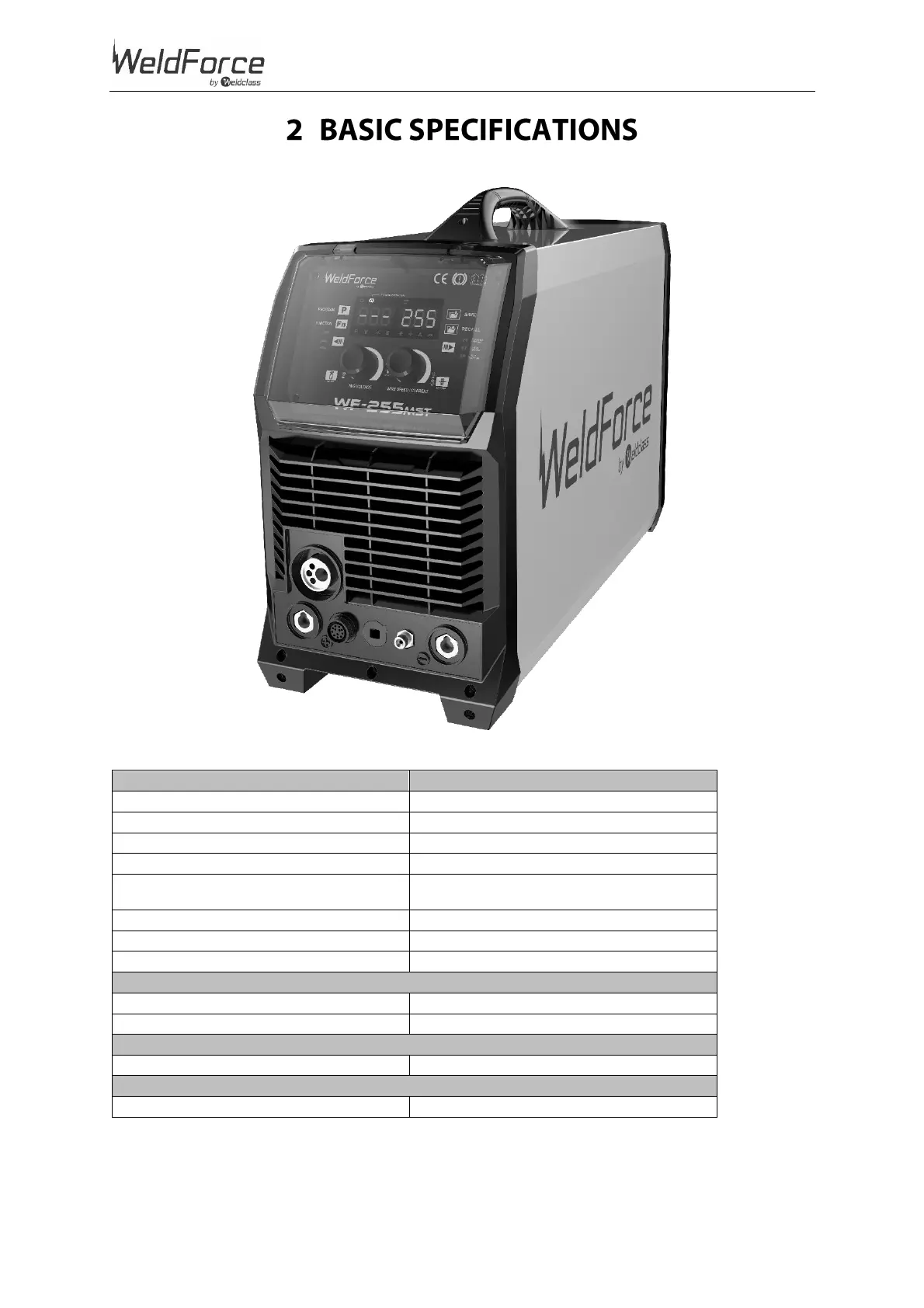 Weldclass WeldForce WF-255MST - 2 Basic Specifications