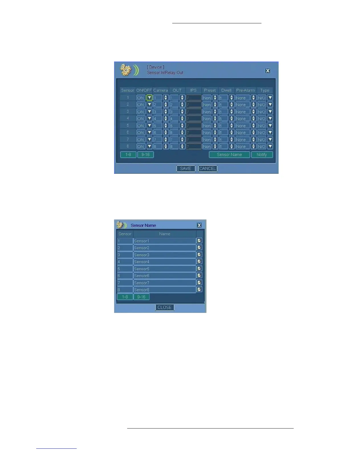 Sensor – List of sensors (1 through 8 and 9 through 16).