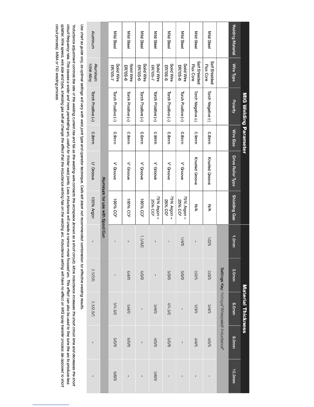 WELDTECH WT200MP - Welding Settings Guide; MIG Welding Parameter Chart