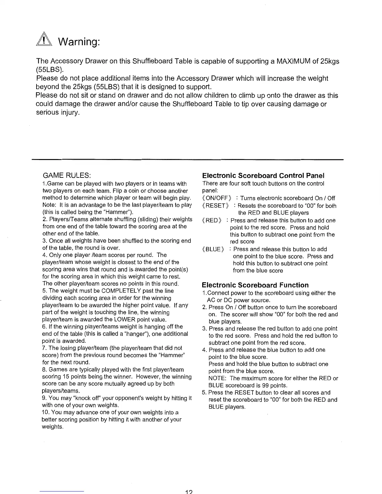 could damage the drawer and/or cause the Shuffleboard Table to tip over causing damage or