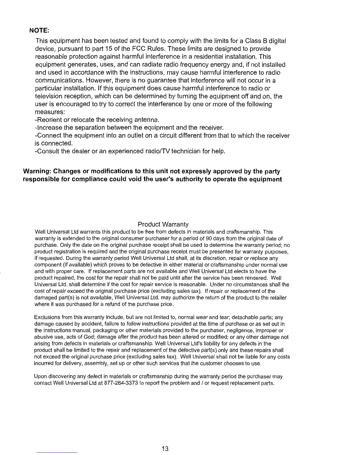Well Universal Ltd warrants this product to