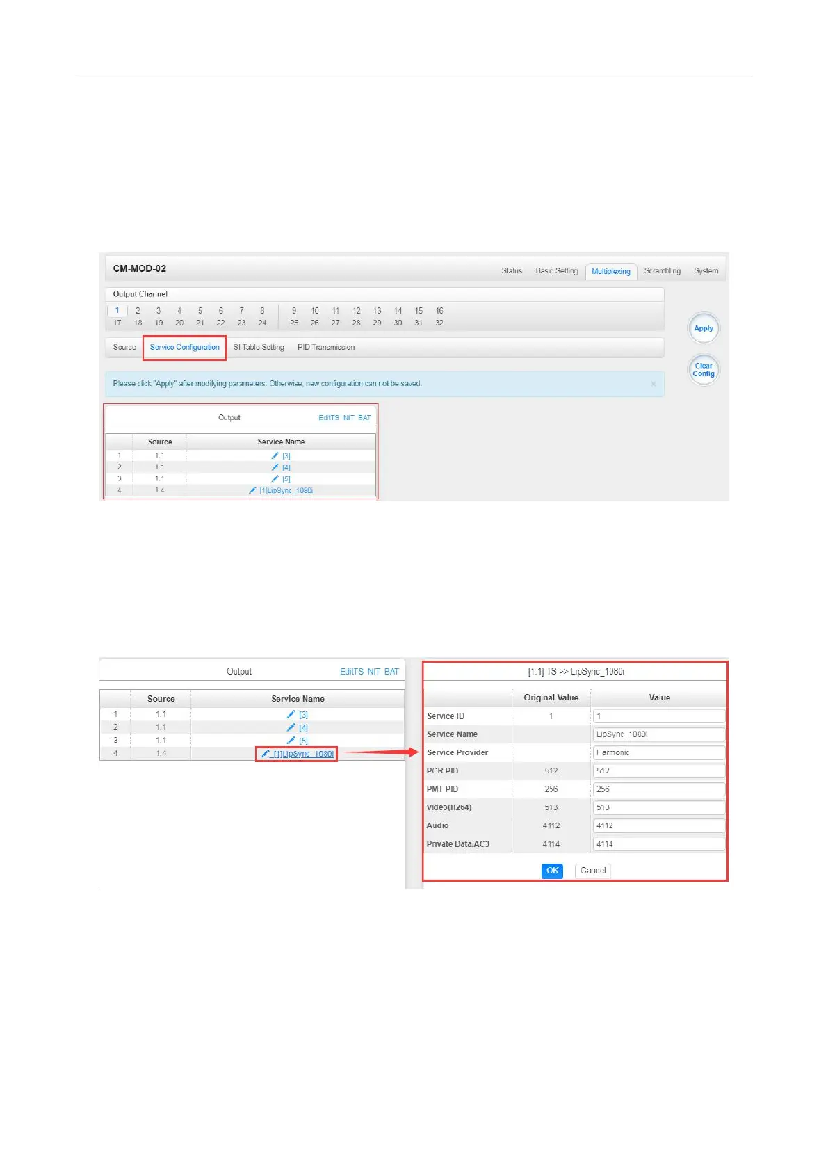 Multiplexing-Service Configuration> After output the services from IP input to Modulation output,