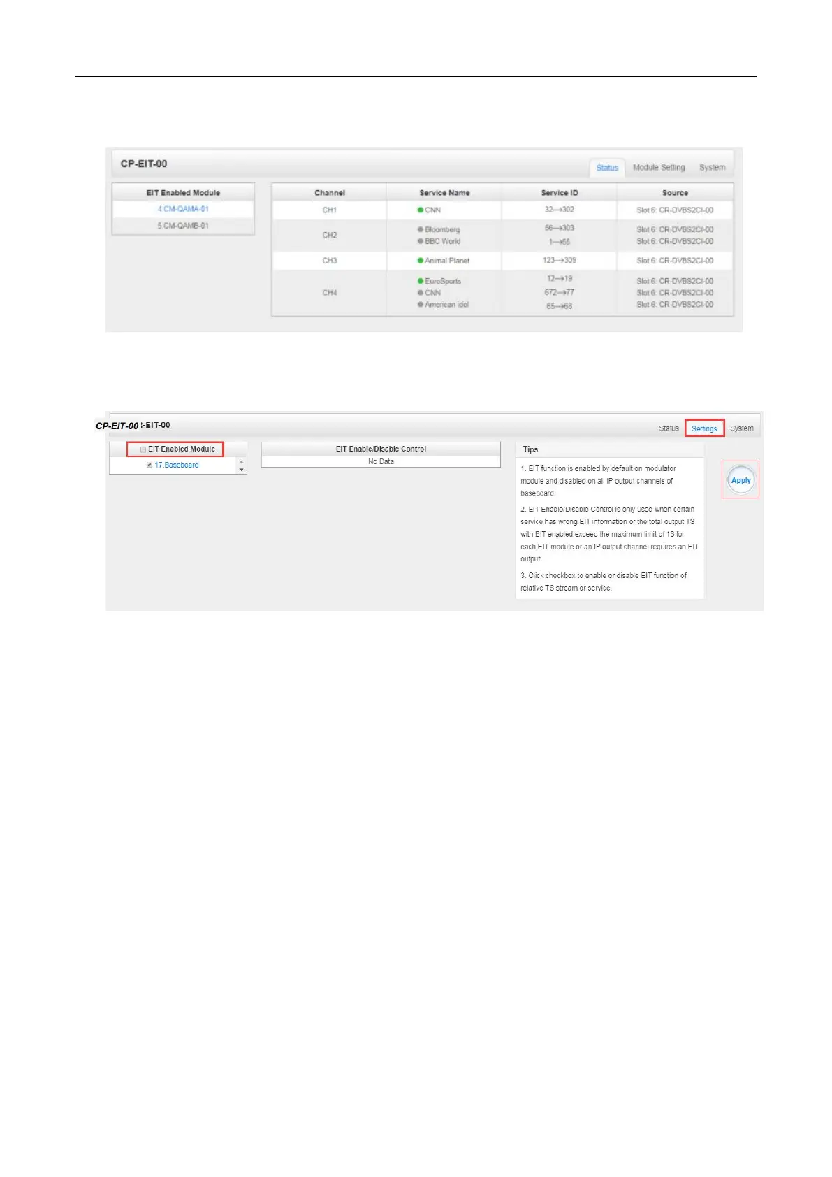 enabled configuration. EIT function is enabled by default on modulator module and disabled on all IP