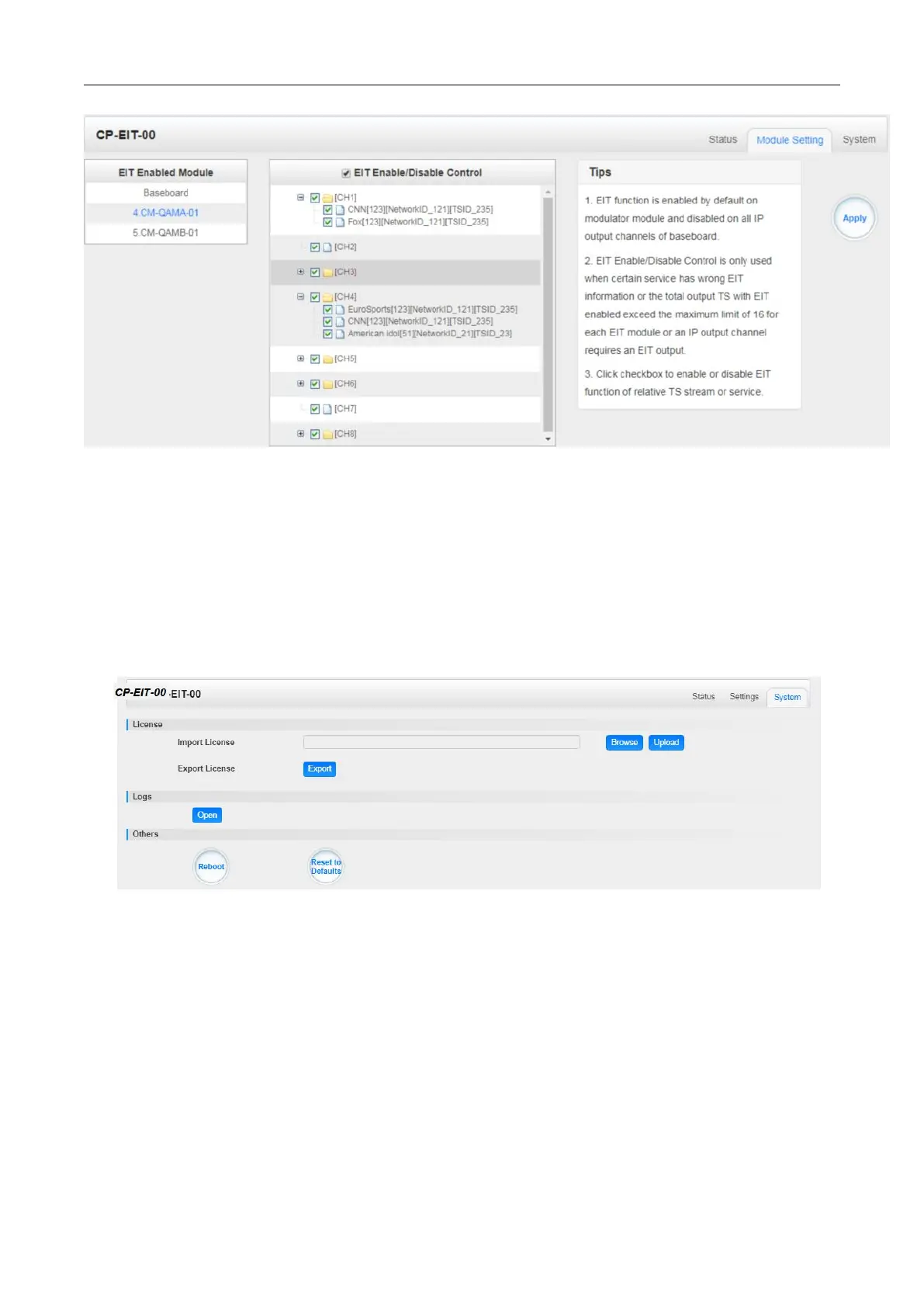 On System page you can import/export license, reboot module, restore factory default setting