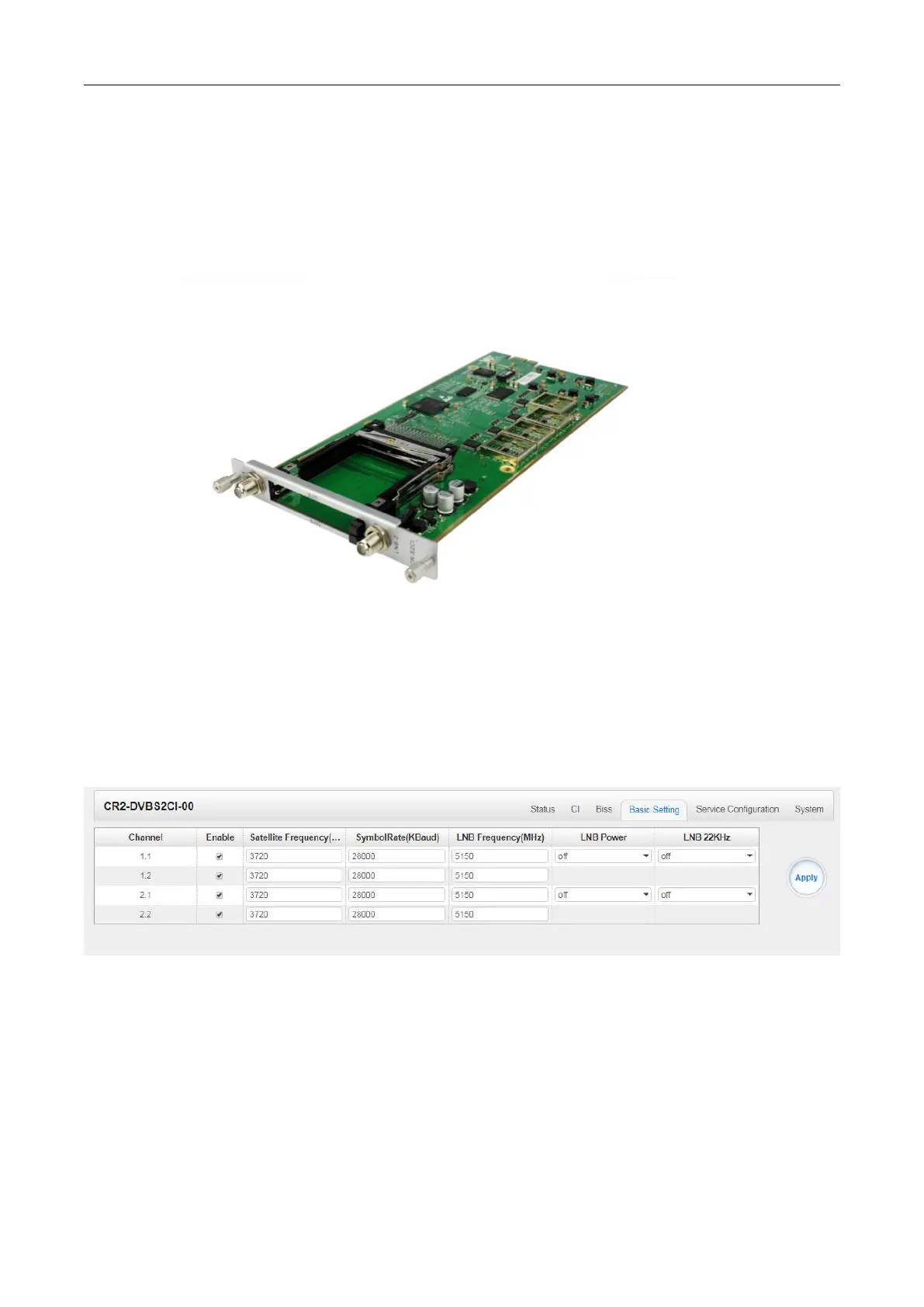 Service configuration is similar to CR2-DVBC-00. Status, CI Status and System refer to