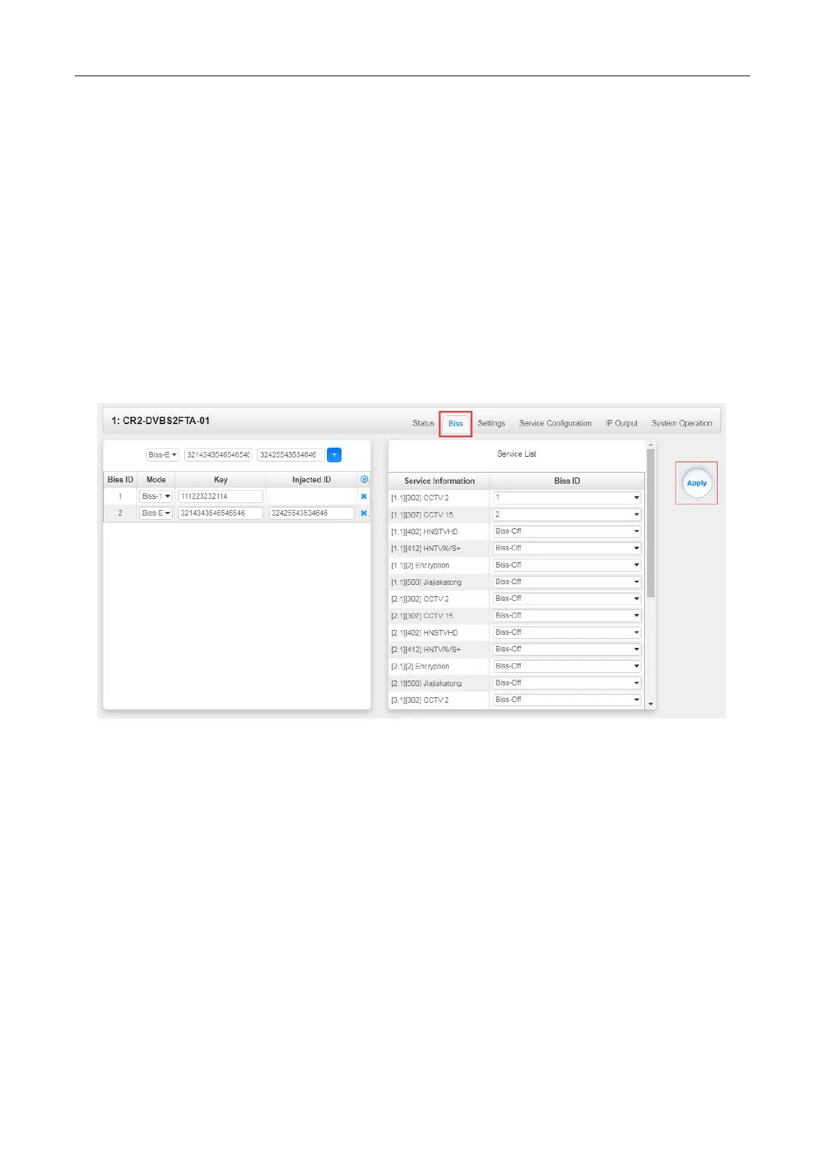 Here you can create Biss ID, including Mode, Key and Injected ID. And you can check the Service