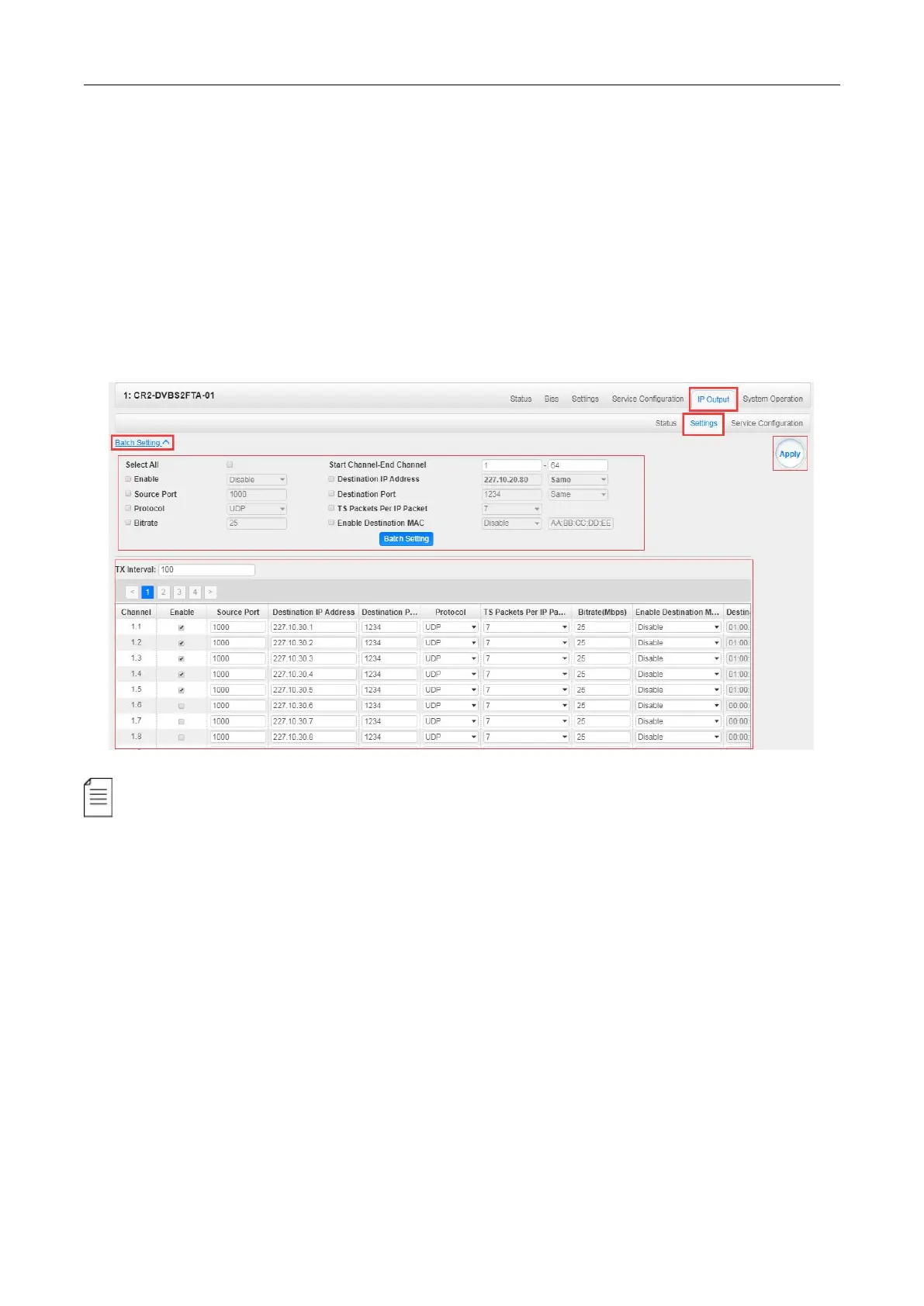 ports and parameters of IP Output. There is also Batch Setting. The destination IP address can be