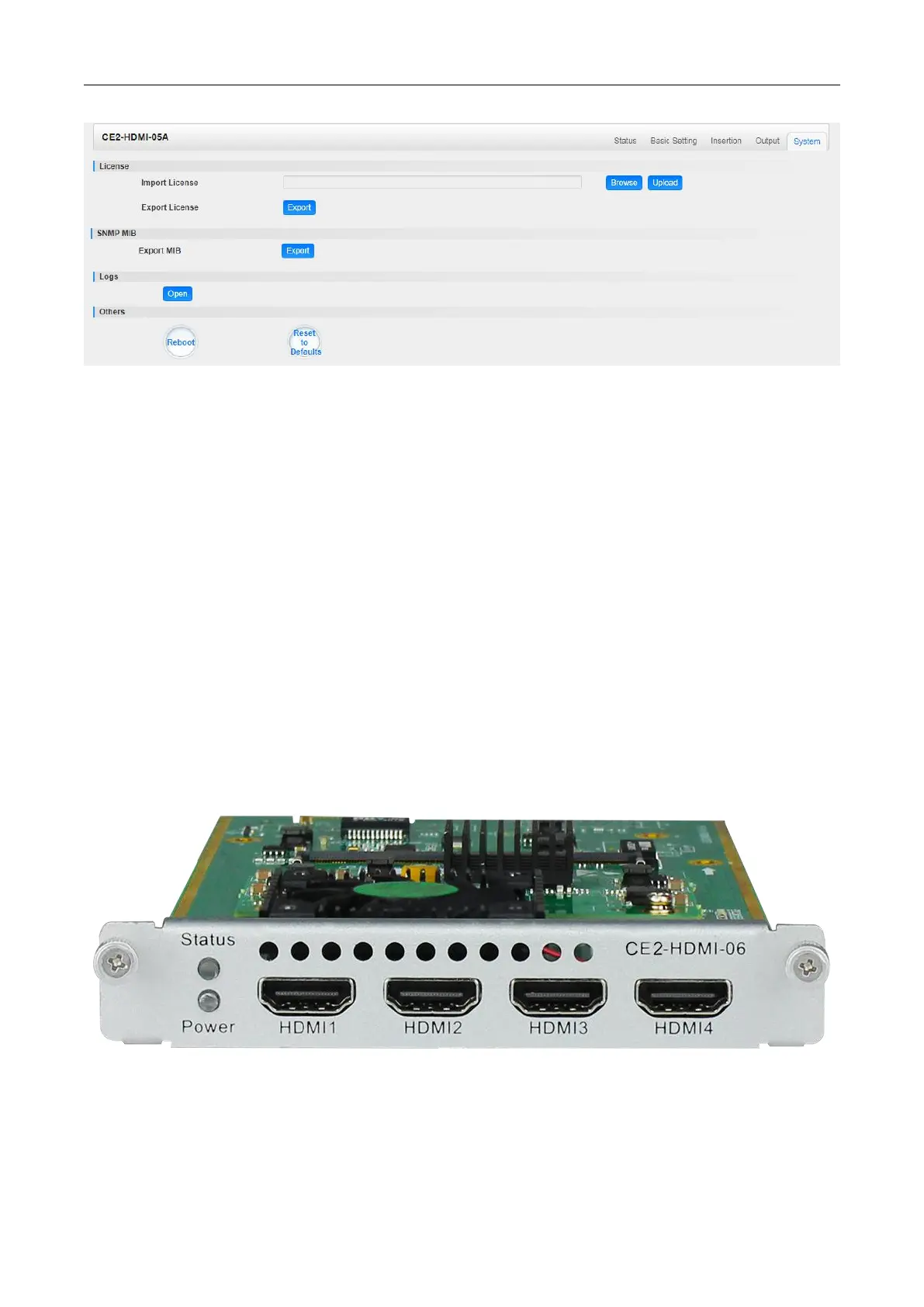 On System page you can Import/Export License, Reboot module, Reset to Dafaults and Manage