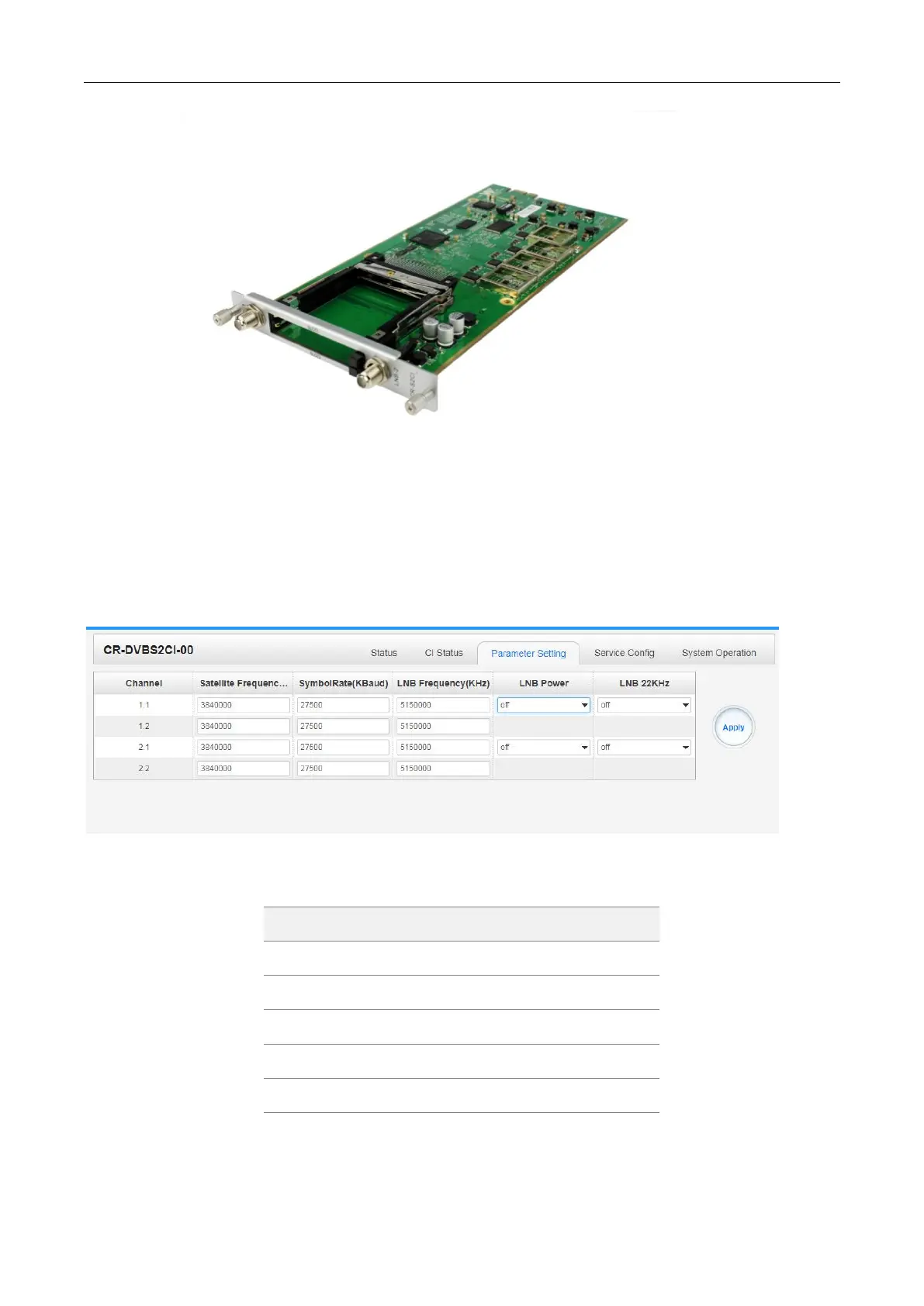 Module configuration is similar to CR-DVBC/DTMB-00. Status and CI pages refer to