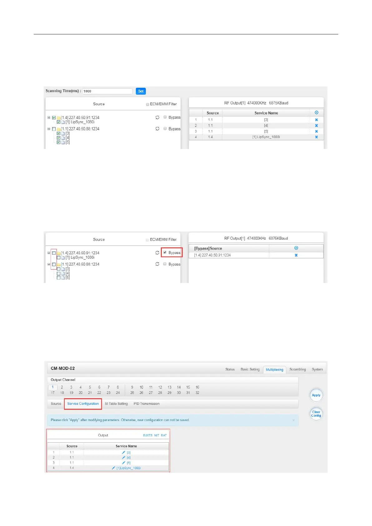 Multiplexing-Service Configuration> After output the services from IP input to Modulation output,