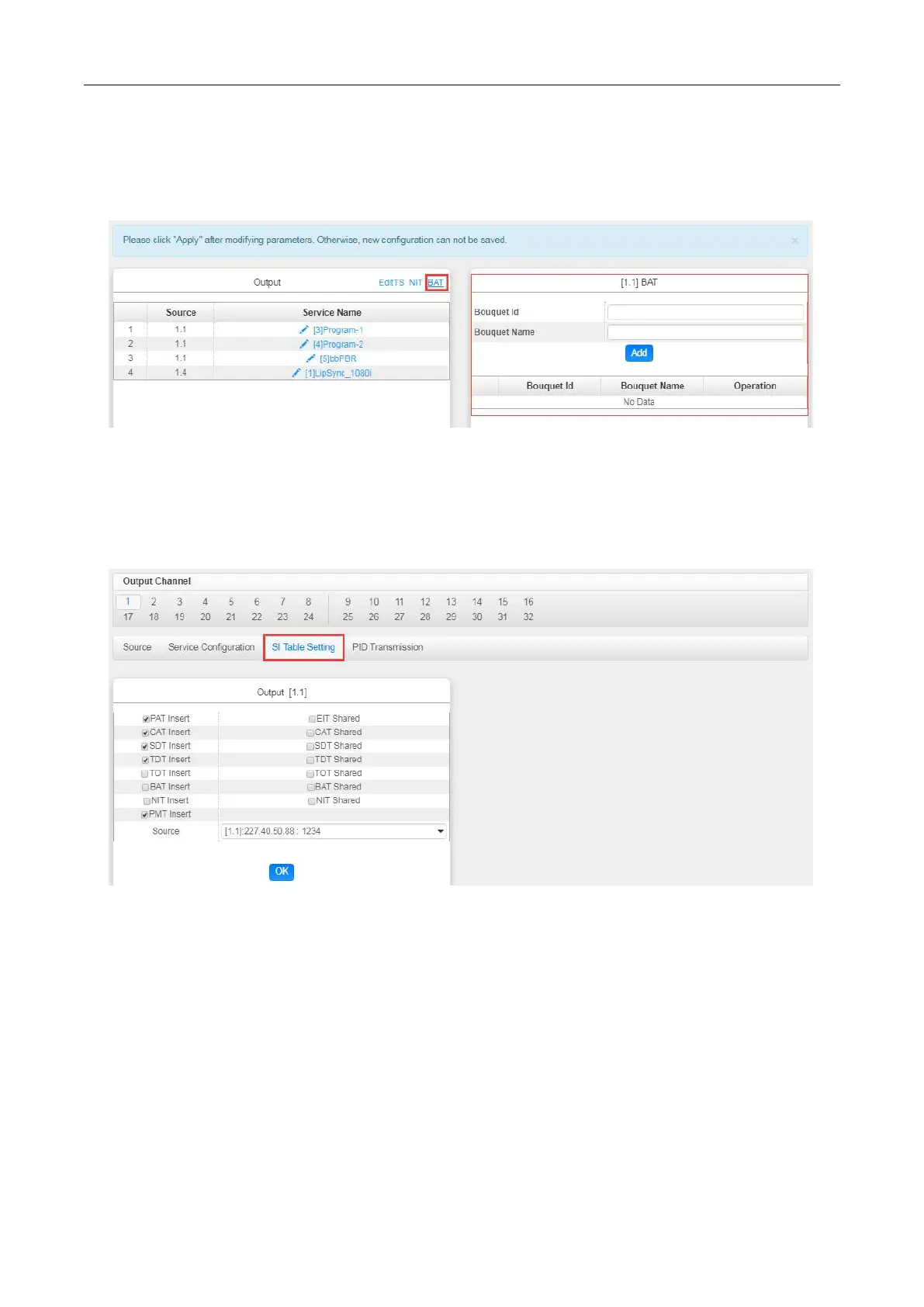Multiplexing-SI Table Setting> This page is to choose whether to insert/generate the SI tables or