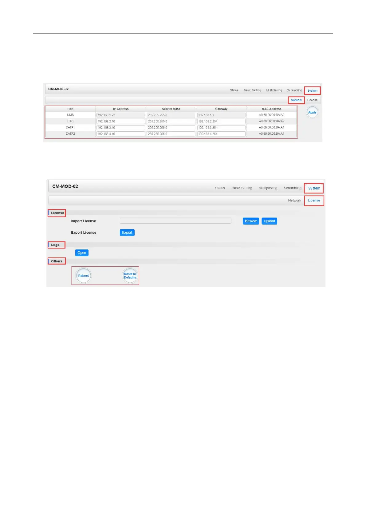 Network> Here you can modify the IP Address, Subnet Mask and Gateway for each port of the