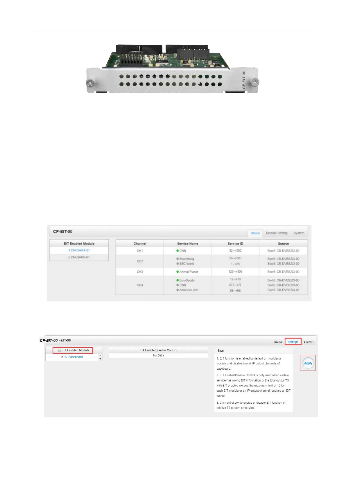 The GUI of EIT module includes three pages: Status, Module Setting and System.