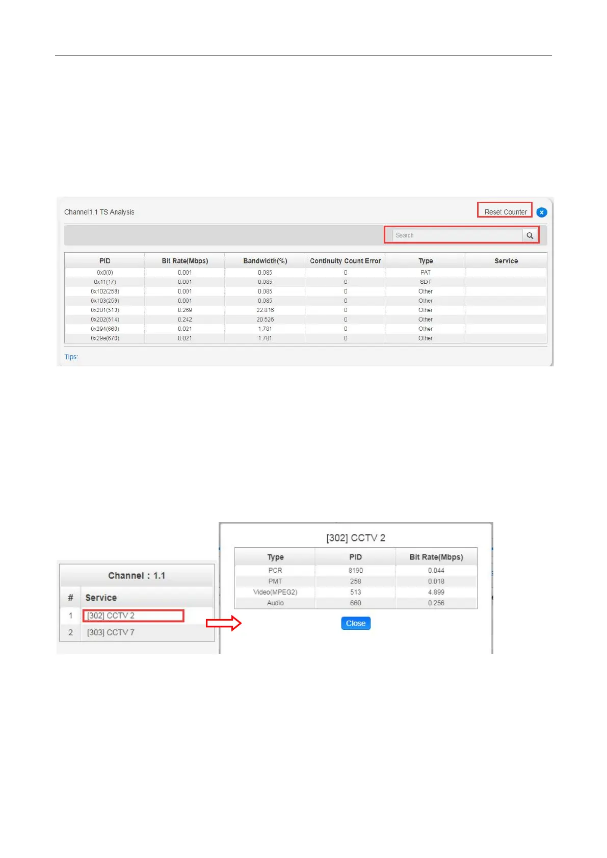 with the key words of PID / Bit rate / bandwidth / table type / service name in the search bar to get the