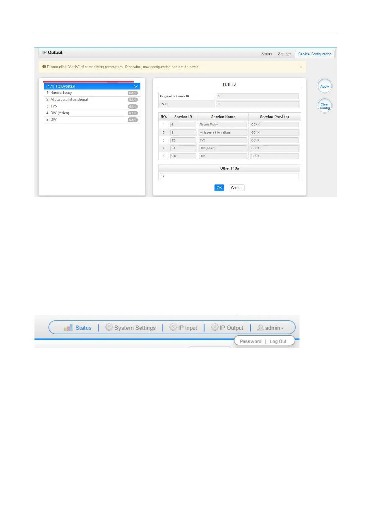 TS setting: Click TS line (the blue area) to configure Original Network ID, TS ID and each