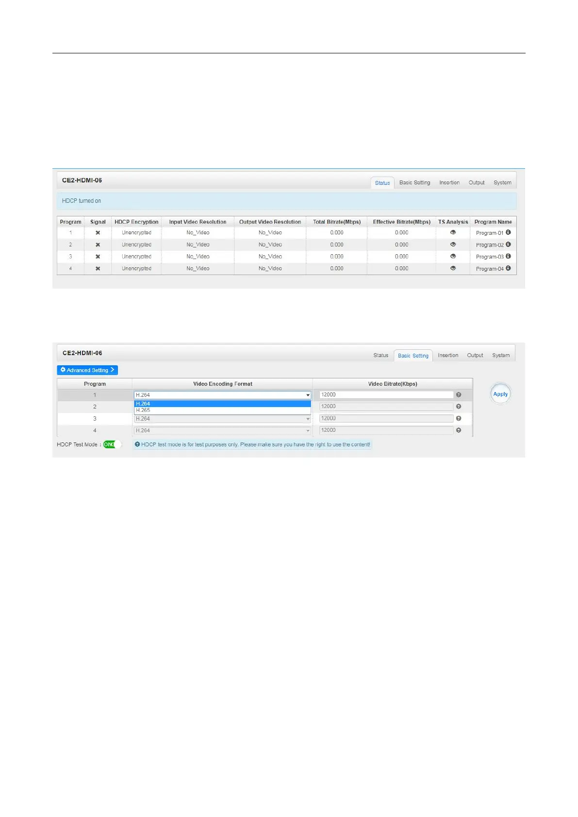 The Status of CE-HDMI-06 shows the Bitrate, input and output Resolution, TS Analysis and Service