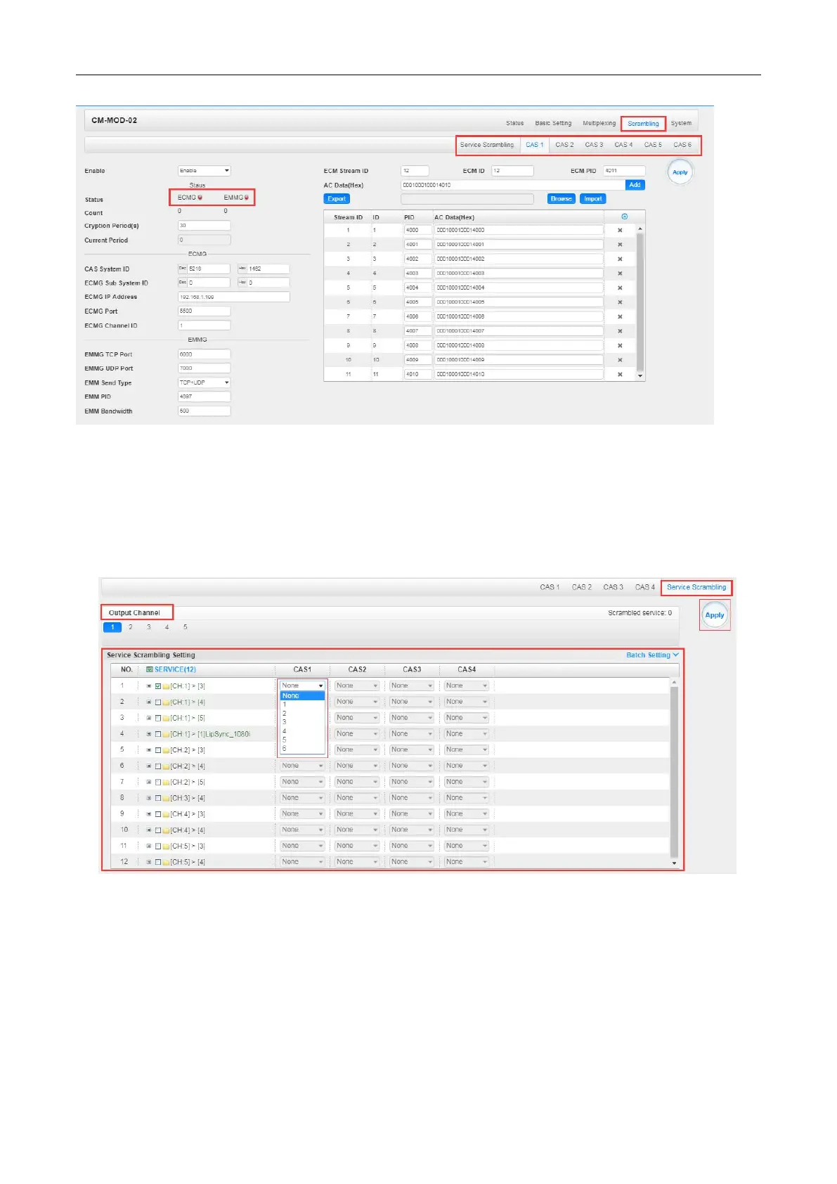 Service Scrambling> On this page, you can encrypt a service in the Modulation Output. Select a