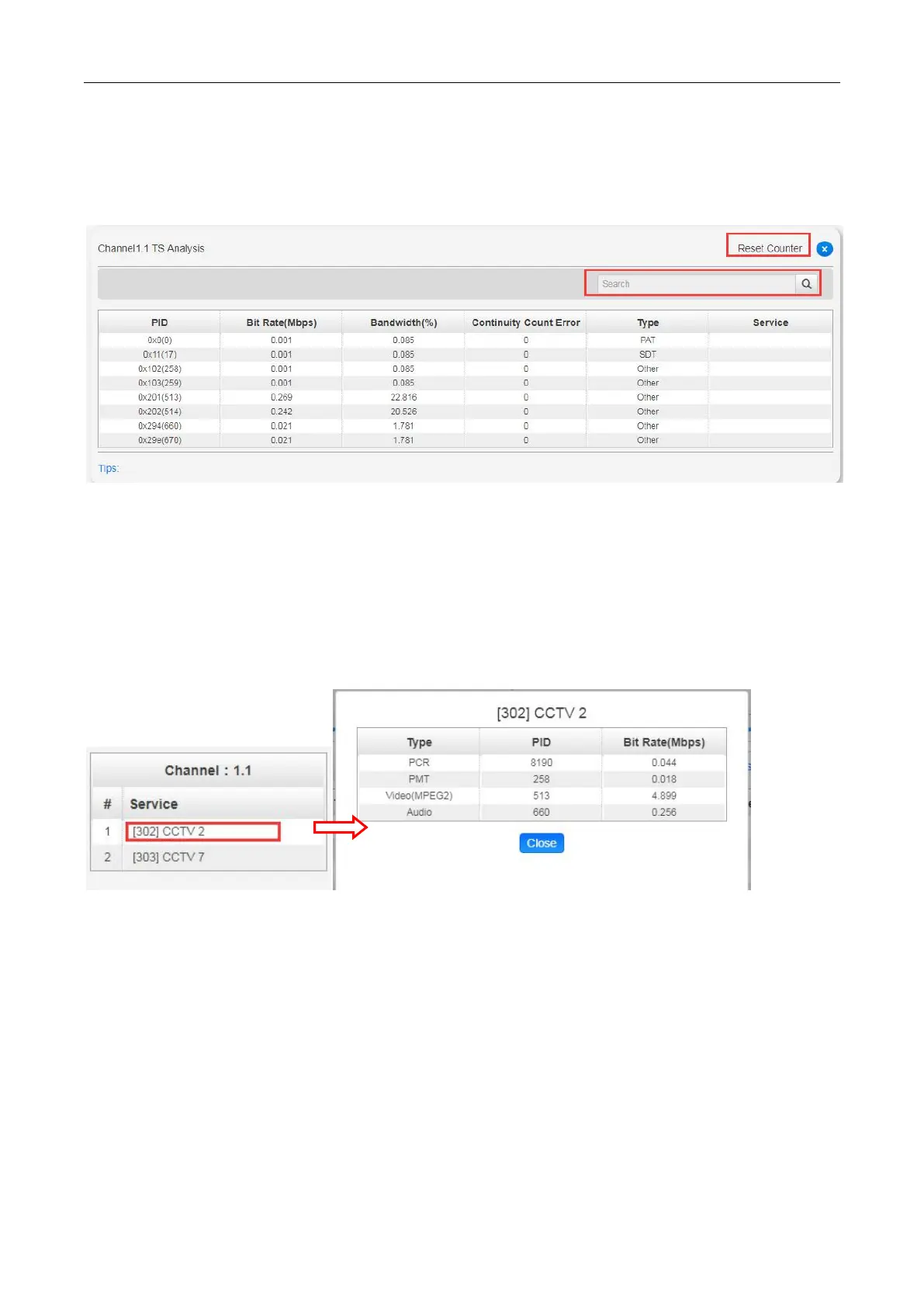 with the key words of PID / Bit rate / bandwidth / table type / service name in the search bar to get the