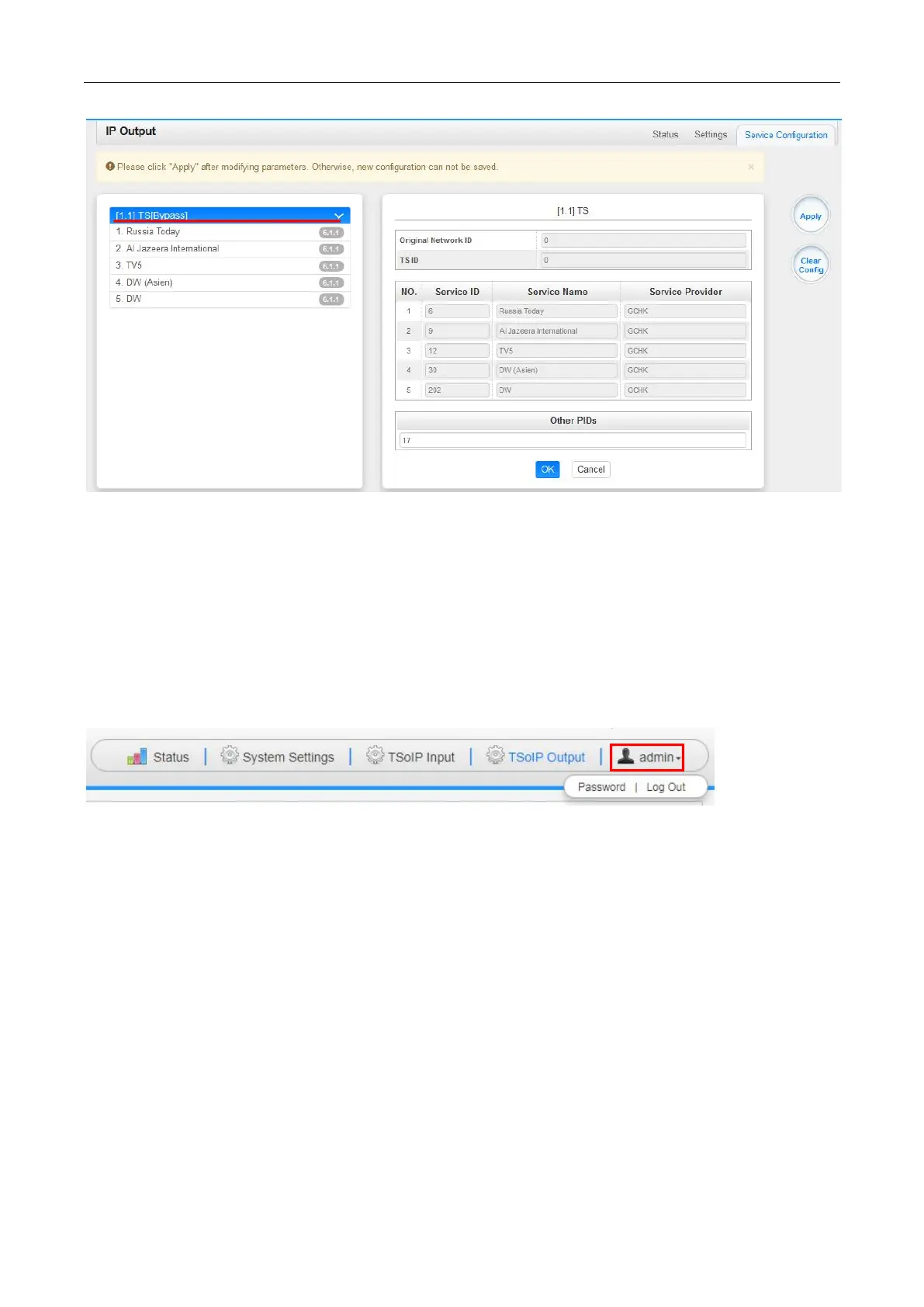 Wellav CMP201D - IP Output Service Configuration: TS and NIT Settings; Admin; Admin Operations